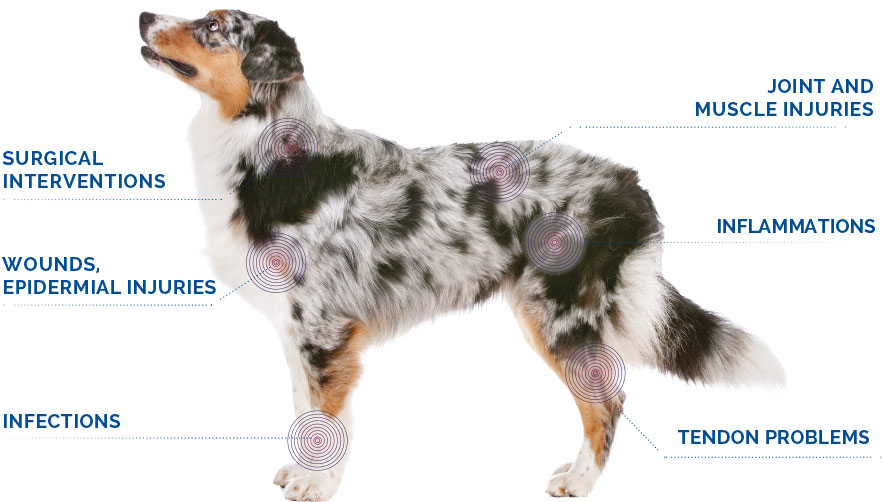 The coherent, high-intensity light of lasers induces a variety of biochemical processes in cells, acting as a catalyst in processes that would otherwise start slowly, with difficulty, or not at all. These cellular processes result in faster cell proliferation, accelerated revascularization, reduced inflammation and oedema, pain relief, and local immunostimulation. Wound healing will be accelerated, the scars left behind by wounds will have nicer cosmetic appearance, the treated animal’s pain will be alleviated, and the mobility of affected body parts will improve.